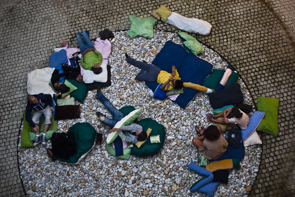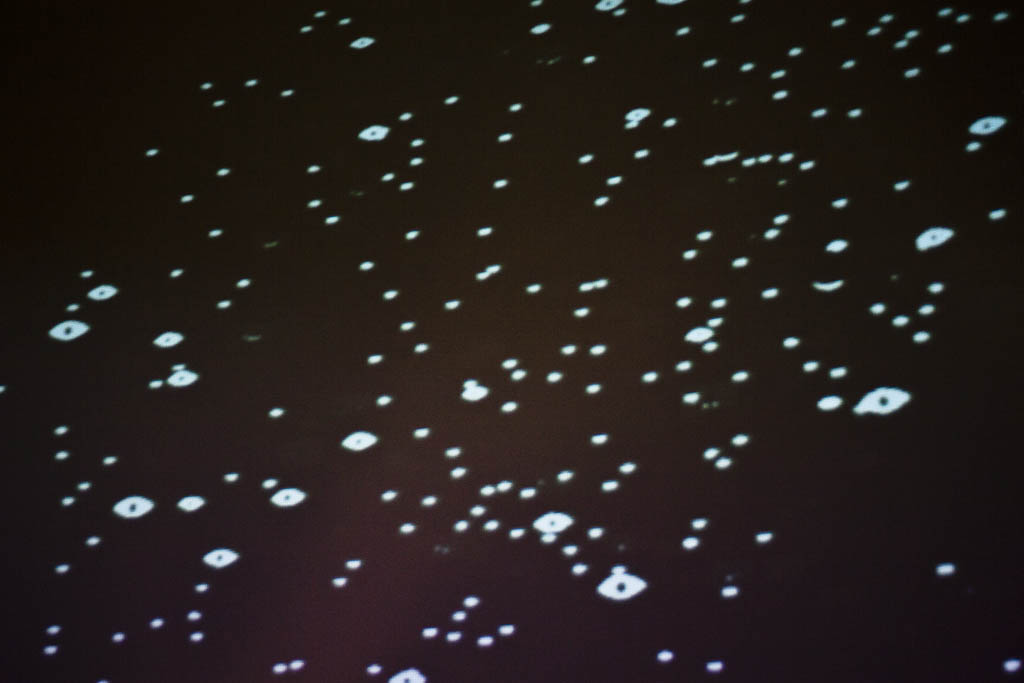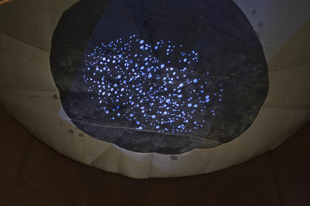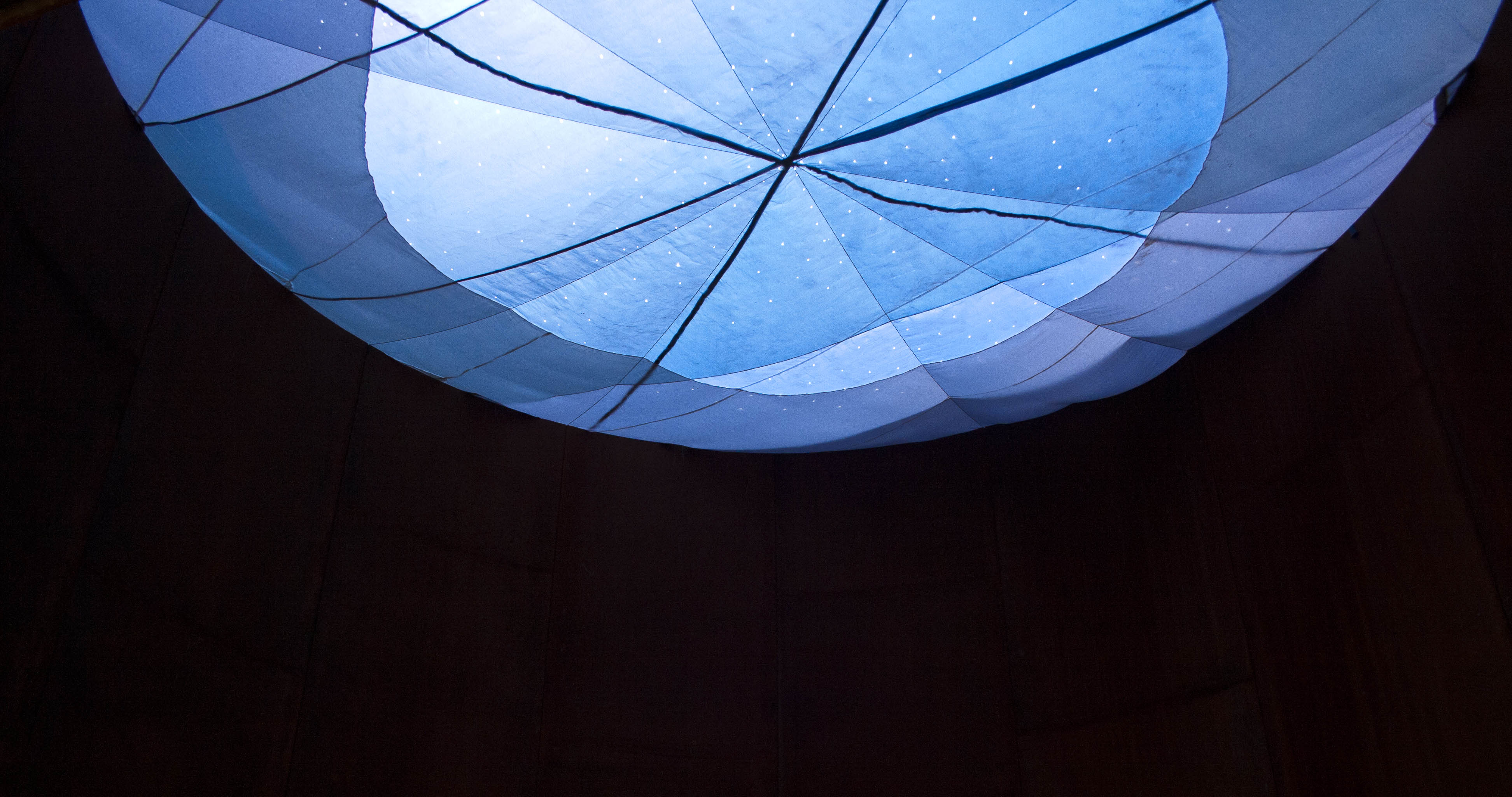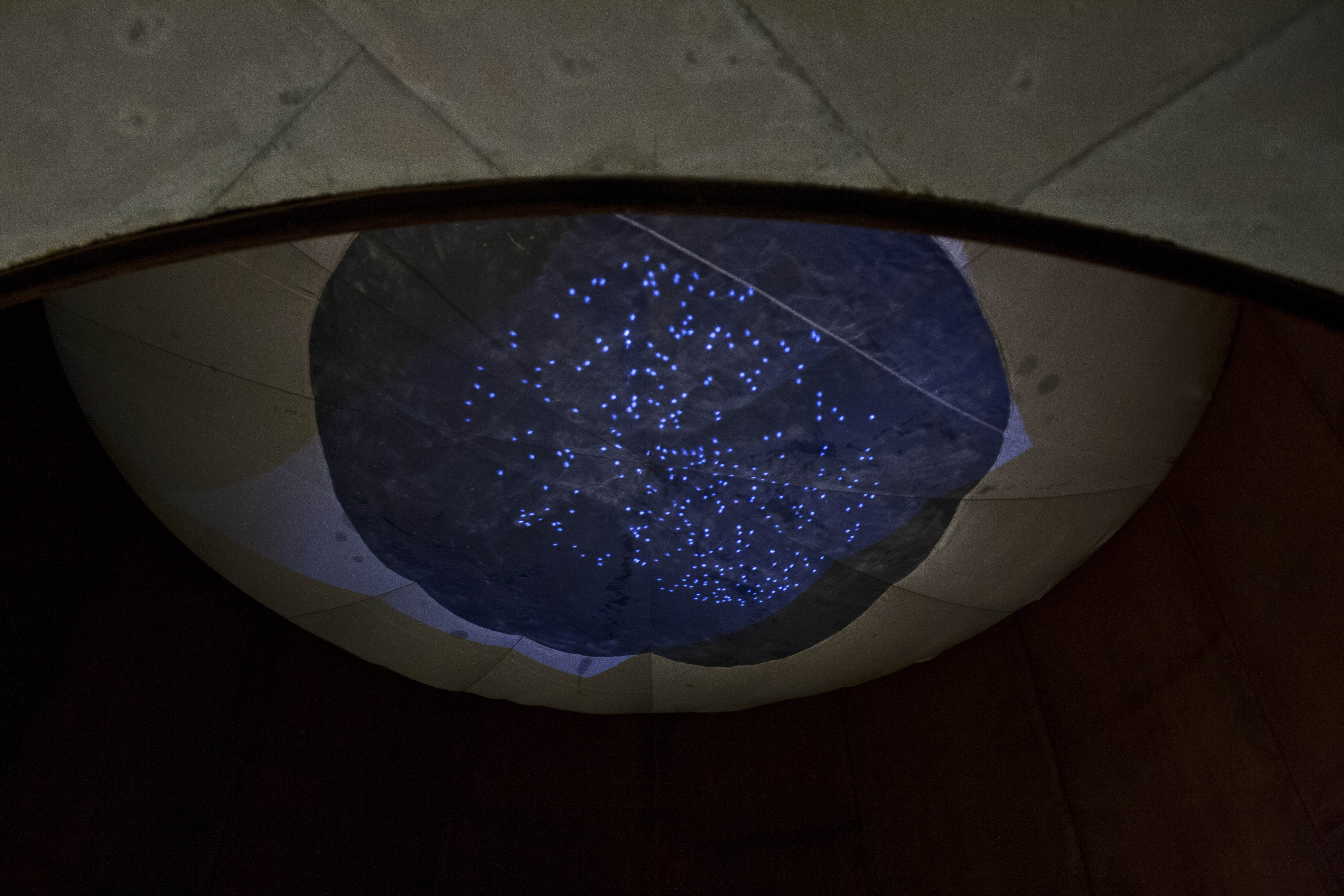 At present, olhar aos olhos is a moving fiction-space, in which one can observe a fictitious sky as if it were as real as life; it’s a space to be horizontal; a space to open your eyes (senses) and see (perceive) everything through what you want to see (perceive), with as many open or closed eyes (senses) you want to see with (perceive). Here both are valid: a conscientious deobservation or any form of synaesthesia, This is an interactive installation experiment where the structures that provide shelter, matter as much as the vibrations they embrace. In the end, it is unknown who supports who. Observers are welcome and needed in this search of a vibrant space and time, as they also become the main characters of the system: it is a state of constant investigation.