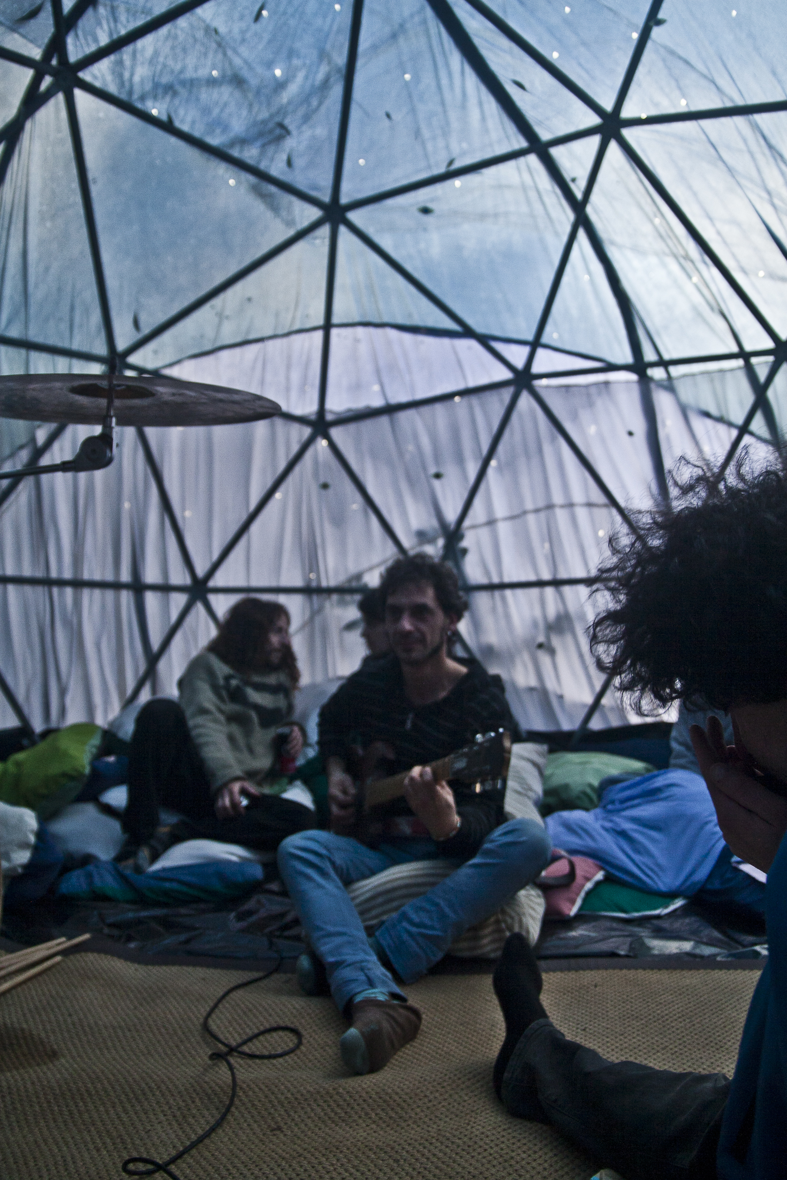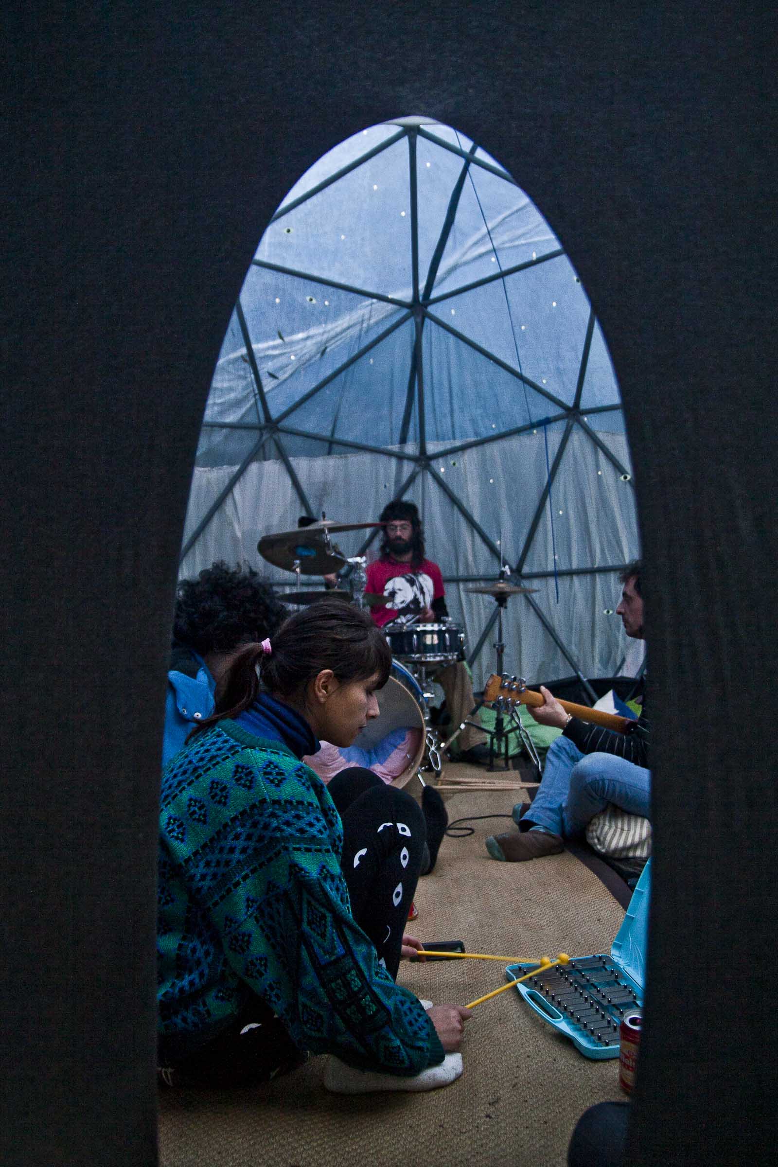 Es un experimento de instalación interactiva, en el que tanto pesan las estructuras que dan el cobijo, como las vibraciones que contienen. Al fin y al cabo no se sabe quien sostiene a quien. Los observadores son tan bienvenidos como necesarios y co-protagonistas del sistema en estado de investigacion constante, en esta búsqueda de un espacio-tiempo vibrable.