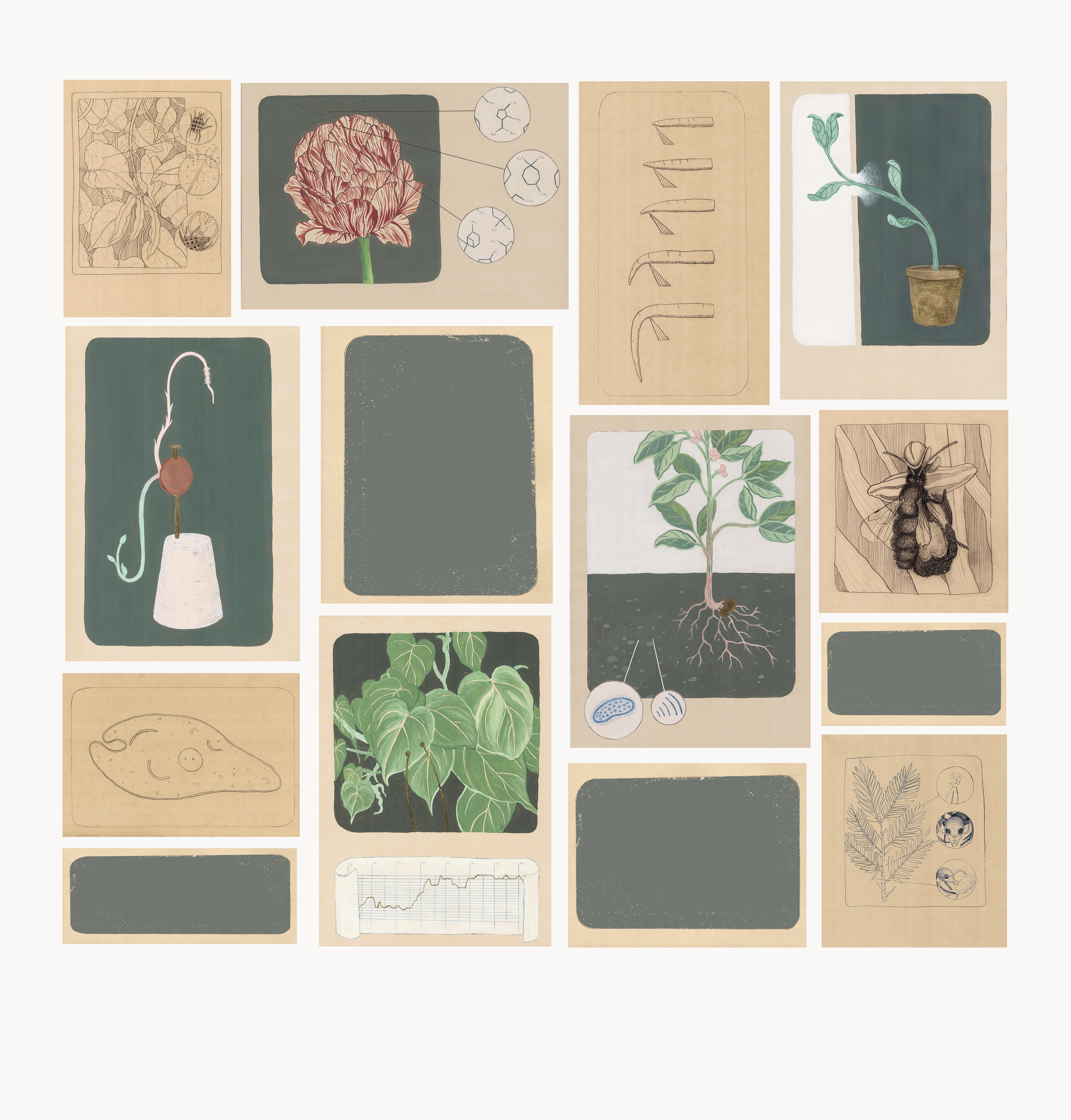 grafito, gouache y lápices acuarelables sobre papel de diferentes medidas ( 1,8×1,8m total)